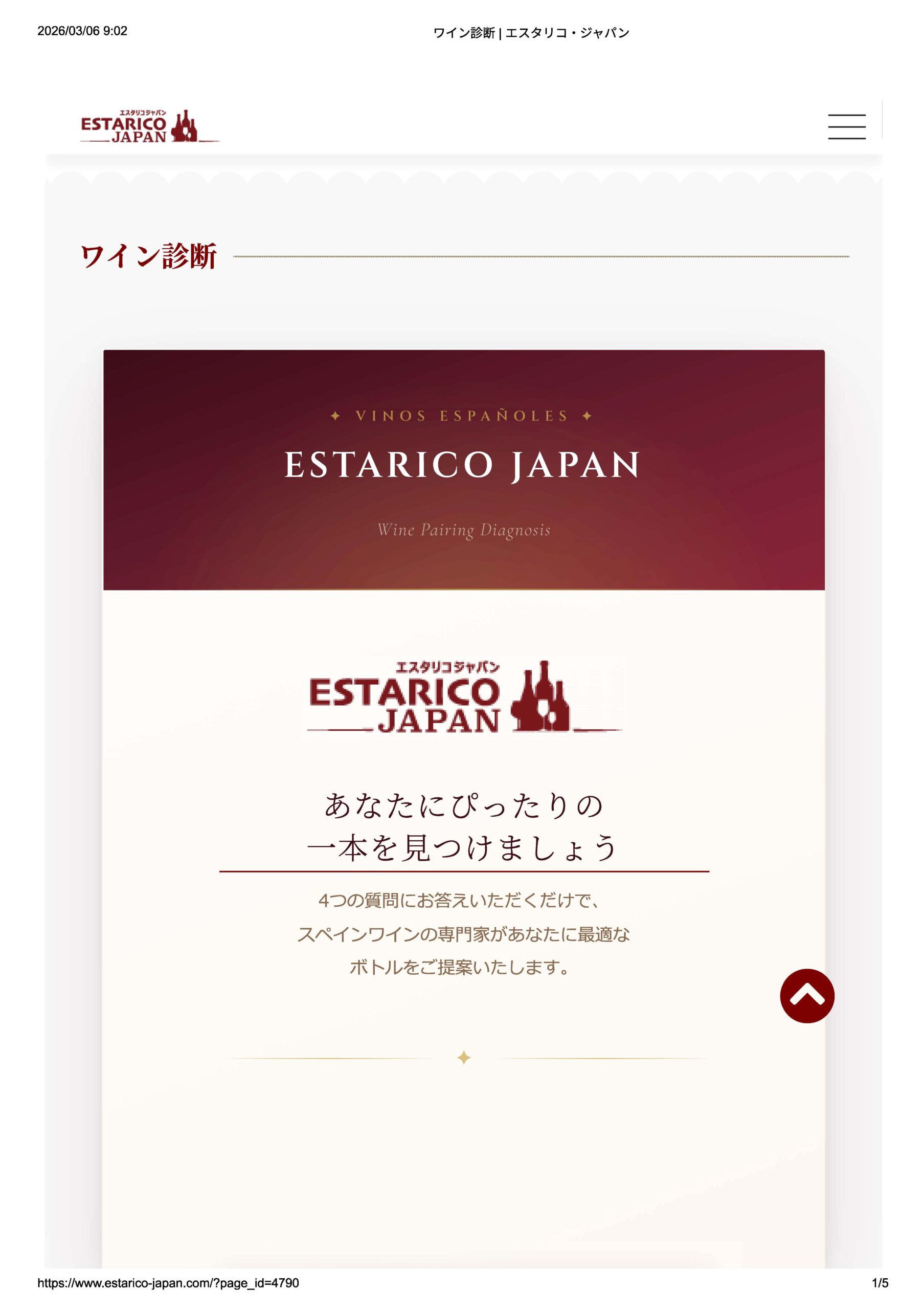 あなたにピッタリのワインを探す、『ワイン診断』機能をウェブサイトに追加しました。 2026年3月6日 スペインワインの豆知識,投稿,未分類 info@estarico-japan.com あなたにピッタリのワインをスペインワインの専門家がご提案する『ワイン診断の』機能をウェブサイトに追加しました。簡単な質問に答えて頂くことにより、素早く最適なワインを見つけることができます。こちらから、お試しください。